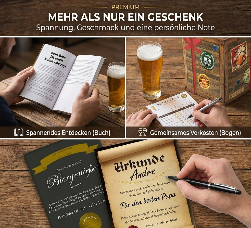 Sie erhalten 9x internationale Spitzenbiere renommierter Brauereien der ganzen Welt + Geschenkkarton in edler Holzoptik (wiederverschließbar) + 6 Geschenkkarten + 3 personalisierbare Urkunden + Bierbewertungsbogen + Gratis Bierbuch (A6, 104 Seiten, Wert €5,95) mit interessanten Infos: Wissenswertes zu den Bieren im Set, Gläserkunde, Bierspiele,...